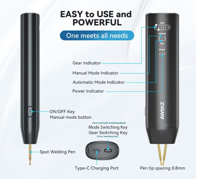 Inspirat de sudarea in puncte originala DIY, sursa de alimentare integrata si stiftul de sudura se combina intr-unul singur, facand sudarea mai usoara fara stift de sudura extern. Sudarea se finalizeaza imediat cu deteriorarea minima a materialului de baza, mai usor si mai sigur. Perfect pentru fabricarea bateriilor.
