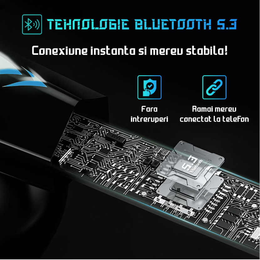 Noile casti wireless bluetooth SHARP PRO, de la sunt compatibile cu orice dispozitiv prevazut cu Bluetooth indiferent de marca (iPhone, Apple, Samsung, Razer, Aqirys, HyperX, Logitech, JBL, Xiaomi, Huawei, Sony, Lenovo, Realme, Nokia, Motorola, OPPO, OnePlus, iHunt, etc.). Aceste casti wireless gaming in-ear, numite de altii si casti bluetooth, casti audio, casti wireless sport, casti wireless copii, casti fara fir, earbuds, earphones, earpods, airpods, casti true wireless, casti tws, casti audio copii, casti wireless ear, casti bluetooth ear, beneficiaza de cea mai noua tehnologie Bluetooth, respectiv 5.3. Astfel, conectivitatea cu dispozitivul tau va fi mai simpla si mai stabila ca niciodata bucurandu-te din plin de experienta de gaming.