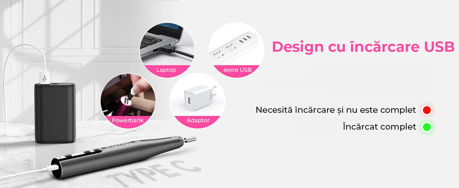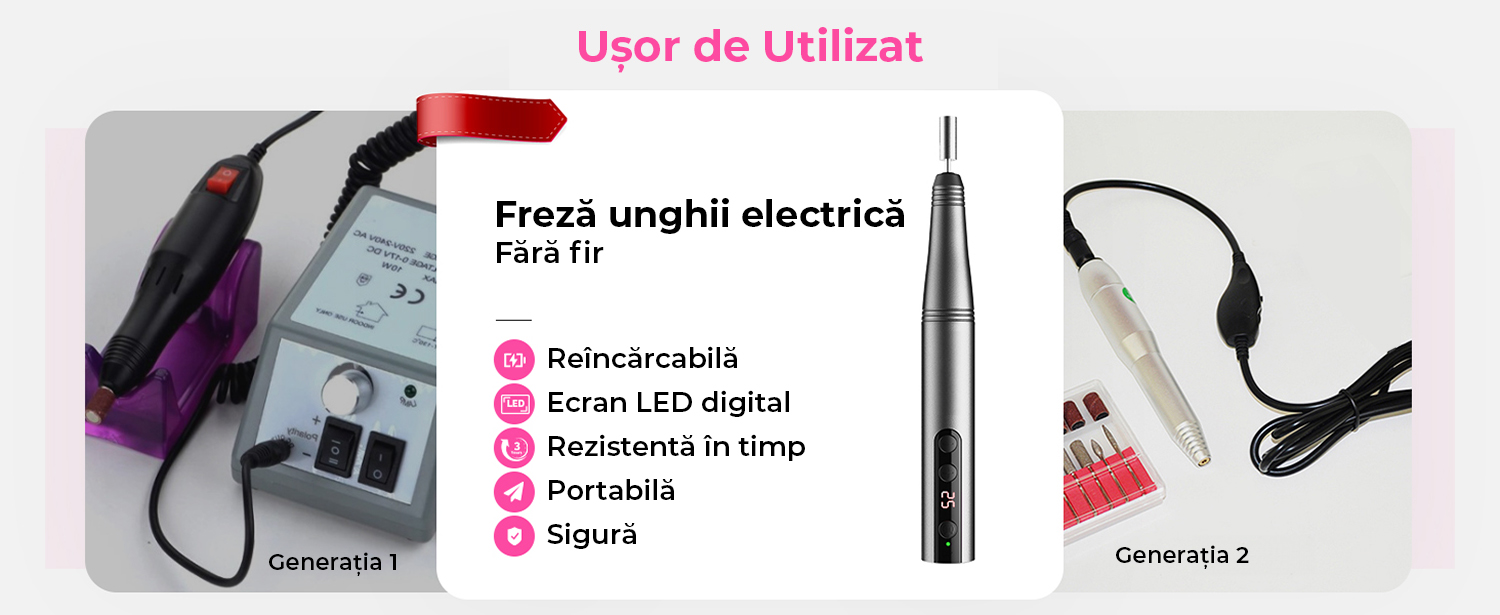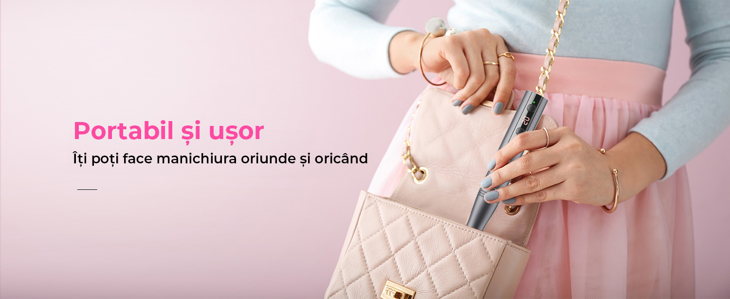 Wireless: Design fara fir, compact si usor, usor de utilizat si de transportat. Se incarca complet in doar 1 ora si poate fi folosit timp de pana la 6 ore. Permite realizarea unor modele de manichiura si pedichiura fara limite de loc sau timp.