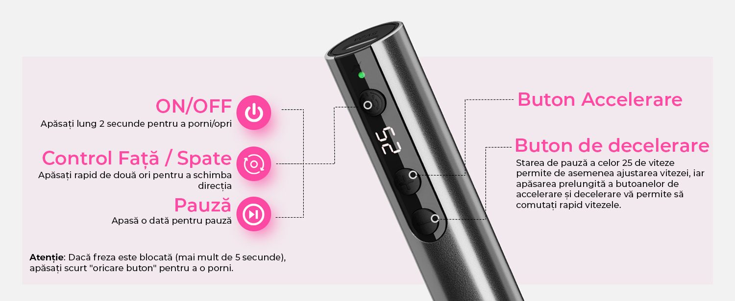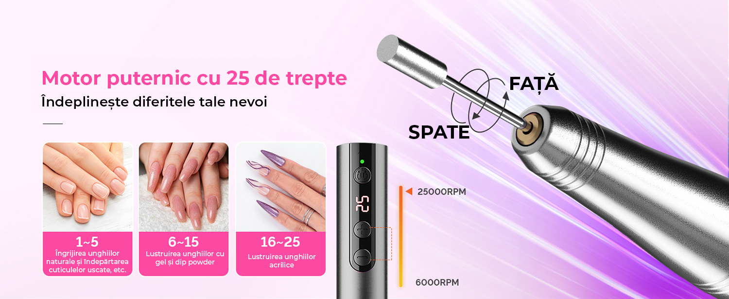 25 de Viteze Ajustabile, Directie Reversibila: Dispune de 25 de viteze ajustabile intre 6000-25.000RPM, functie de pauza si functie de directie F/S pentru utilizare cu mana dreapta sau stanga. Potrivit pentru profesionisti si incepatori, reducand timpul de lucru la jumatate.