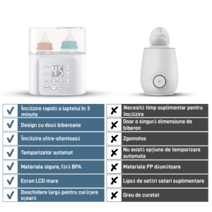 Incalzitorul dublu pentru biberoane cu functie de sterilizare este dispozitivul perfect pentru parintii ocupati. Incalzeste biberoanele rapid si uniform si sterilizeaza-le pentru siguranta bebelusului tau. Cu functia de incalzire 24 de ore, iti asigura ca vei avea hrana calda pentru bebelus oricand, inclusiv pe timp de noapte. Compact si usor de folosit, acest produs iti face viata mai usoara.