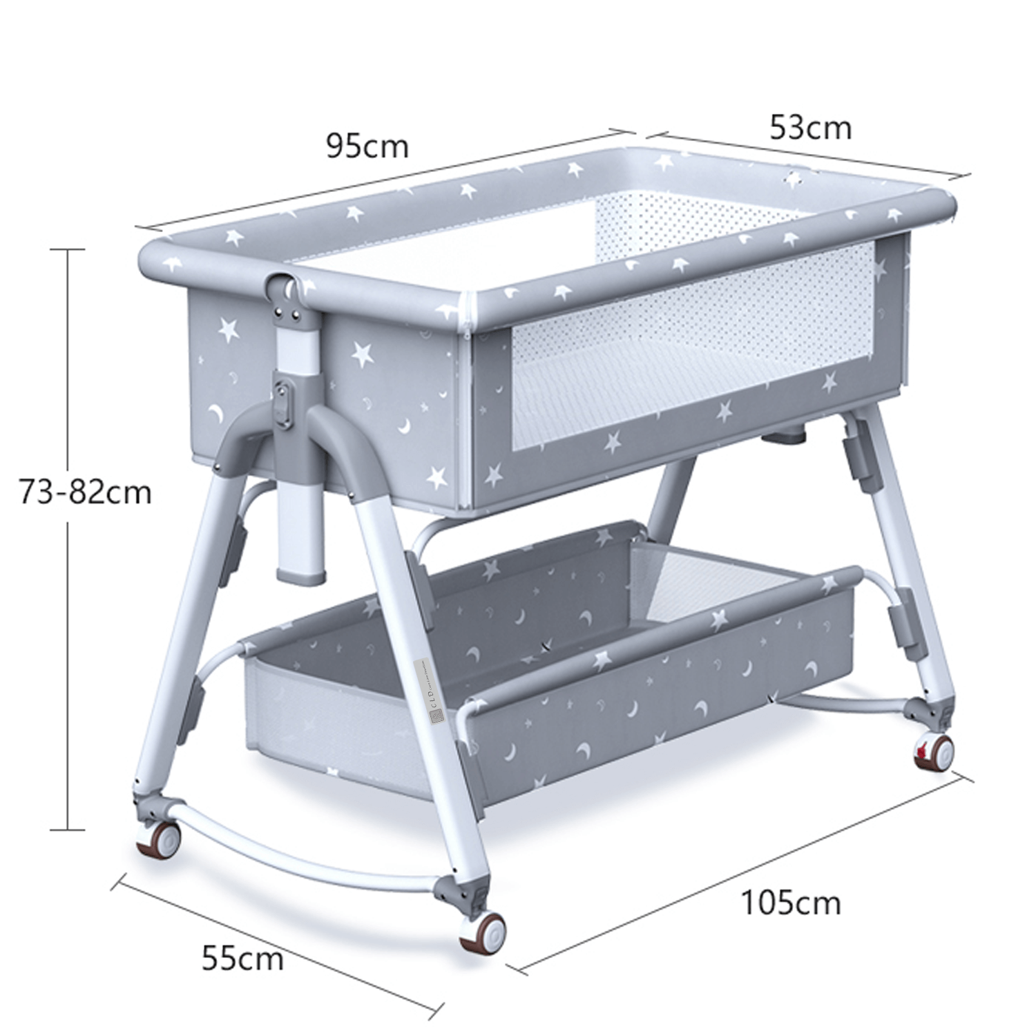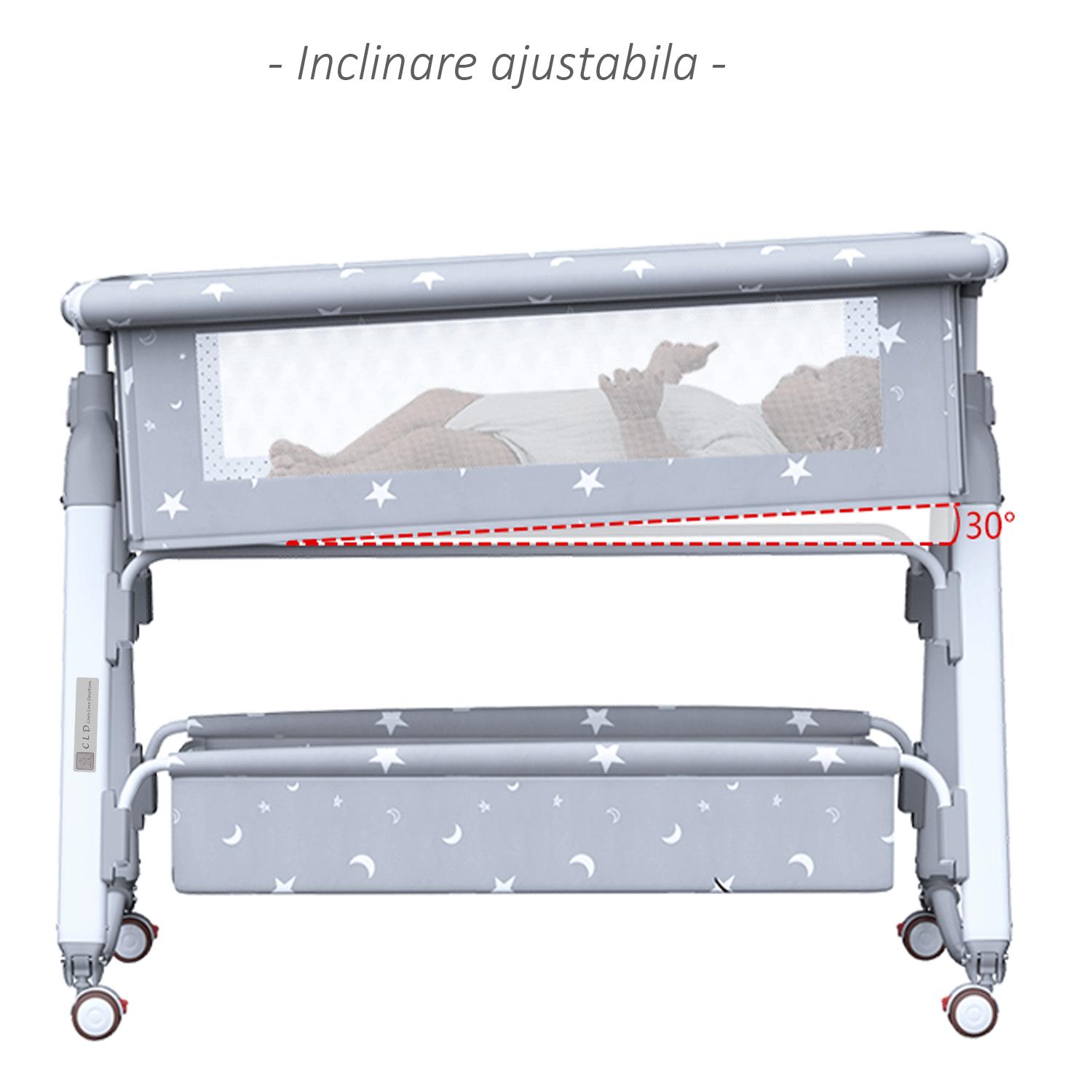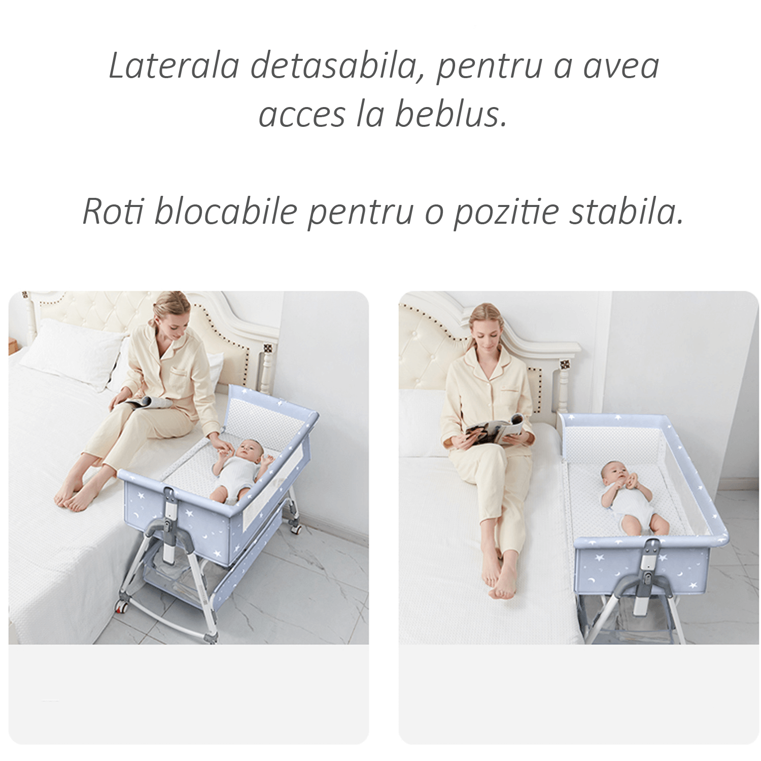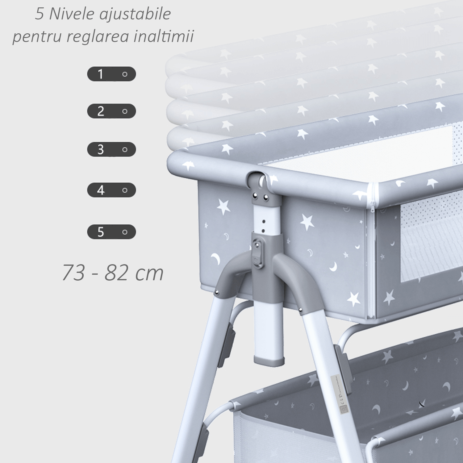 Husa se poate demonta pe lateral, astfel ca, daca doriti sa asezati patutul langa patul dumneavoastra, ajustand si inaltimea, aveti bebelusul la nivelul dorit si usor accesibil.