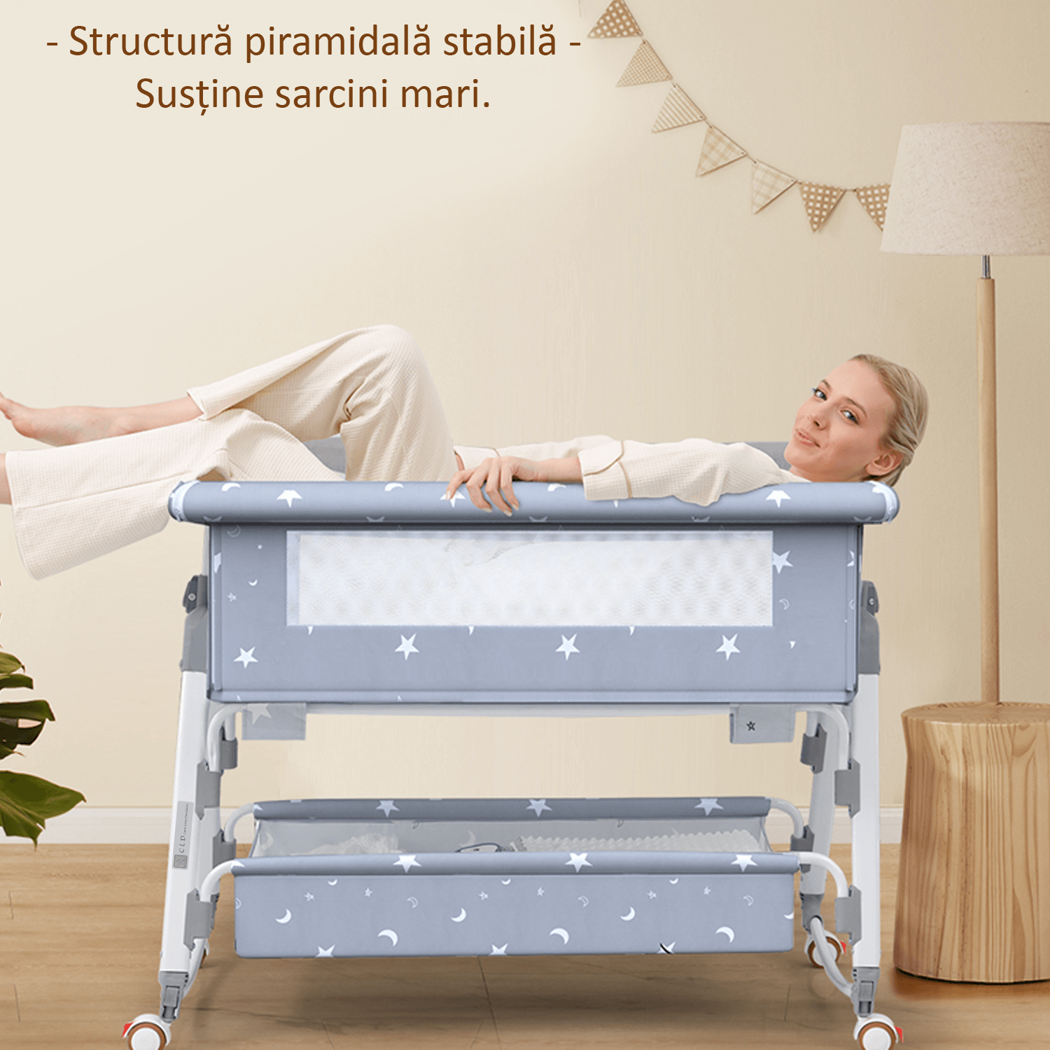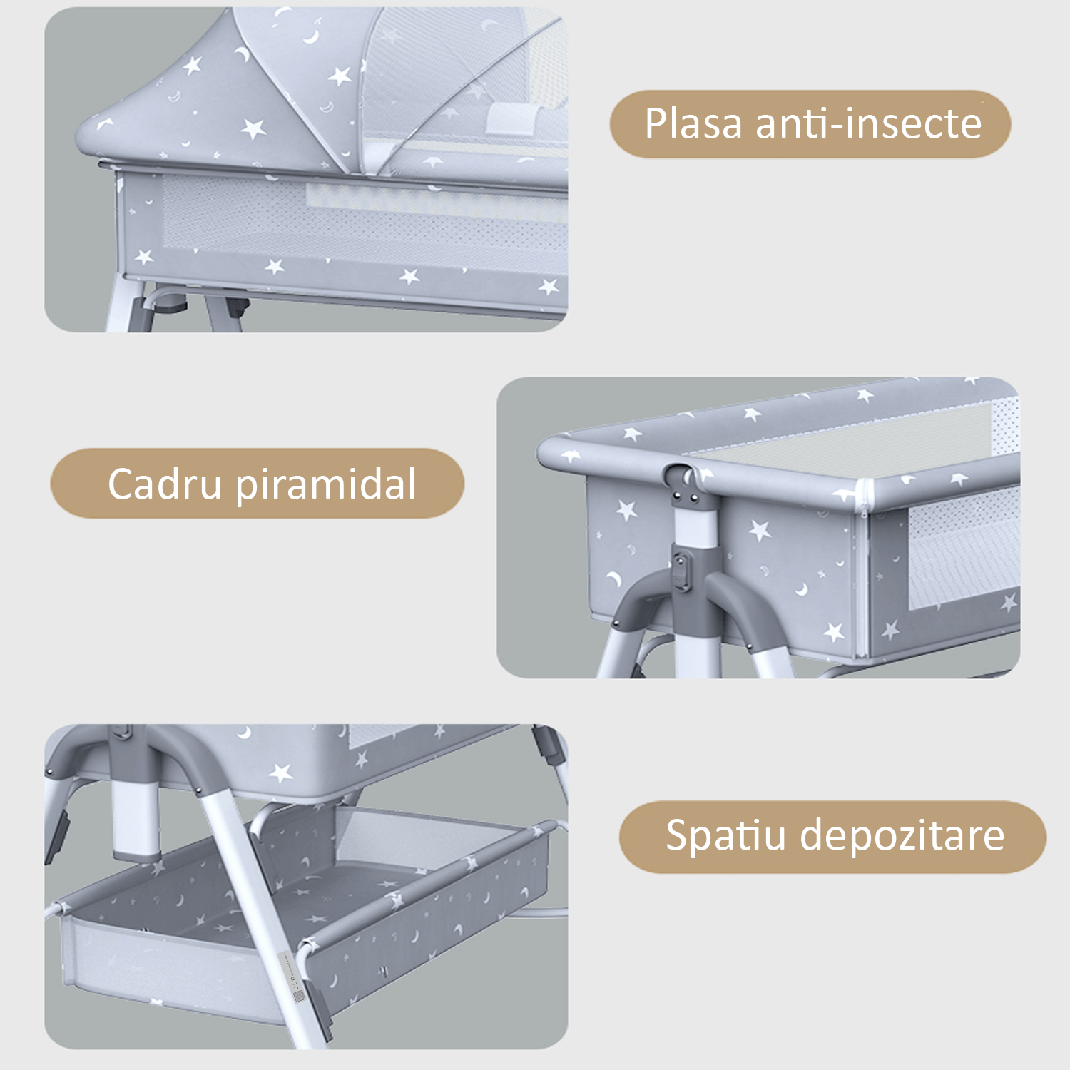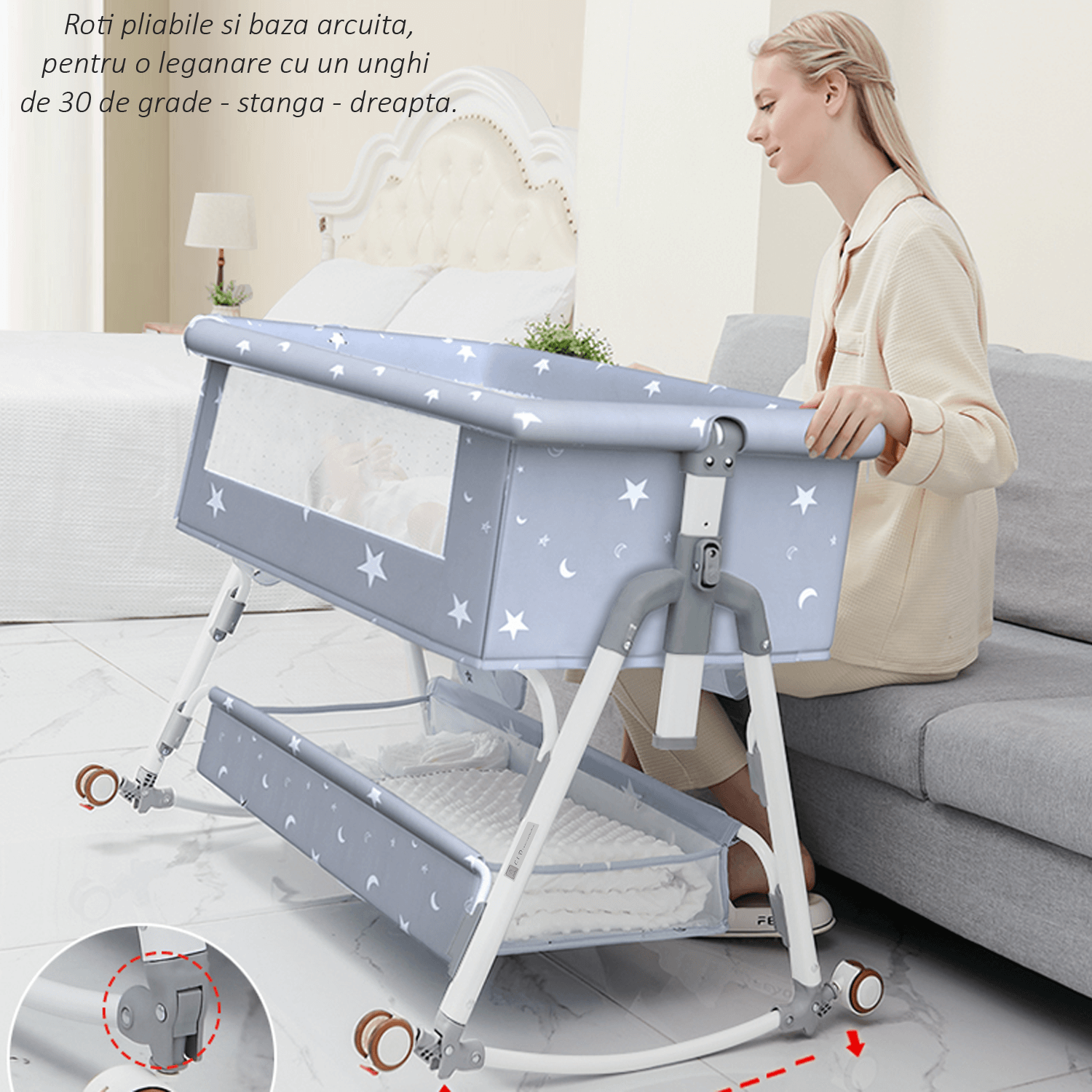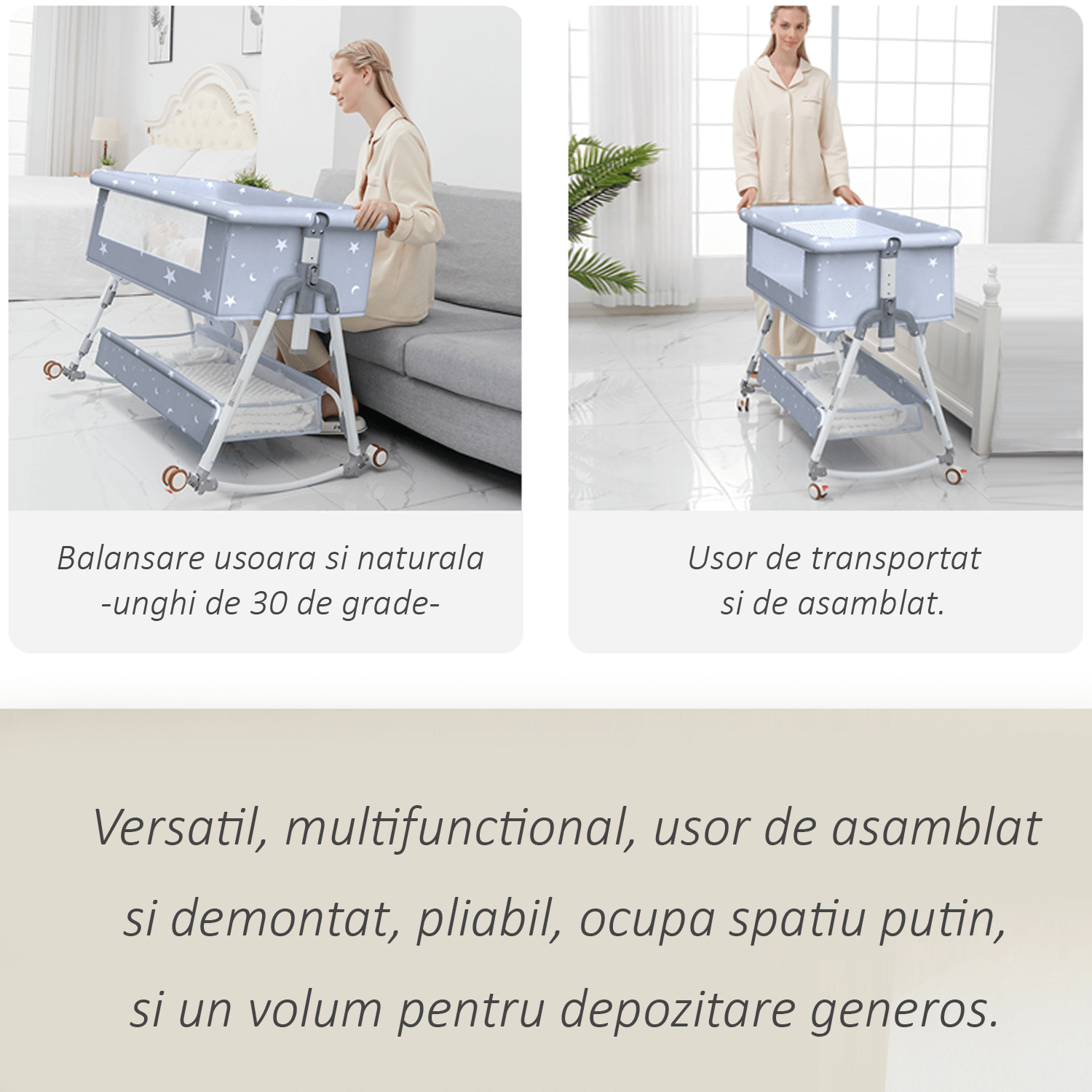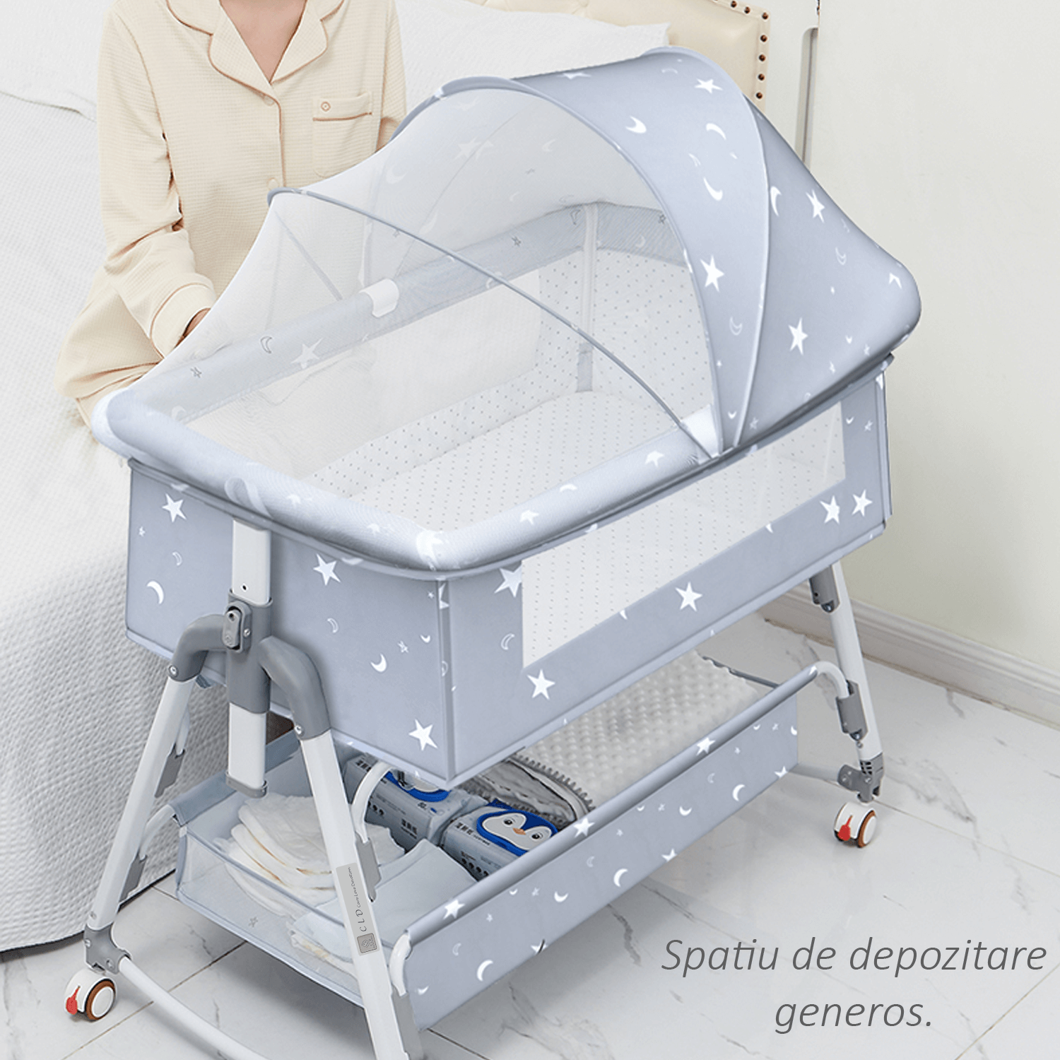 Patut Multifunctional Bebelusi, inaltime ajustabila, spatiu de depozitare, roti pliabile, plasa de protectie, salteluta