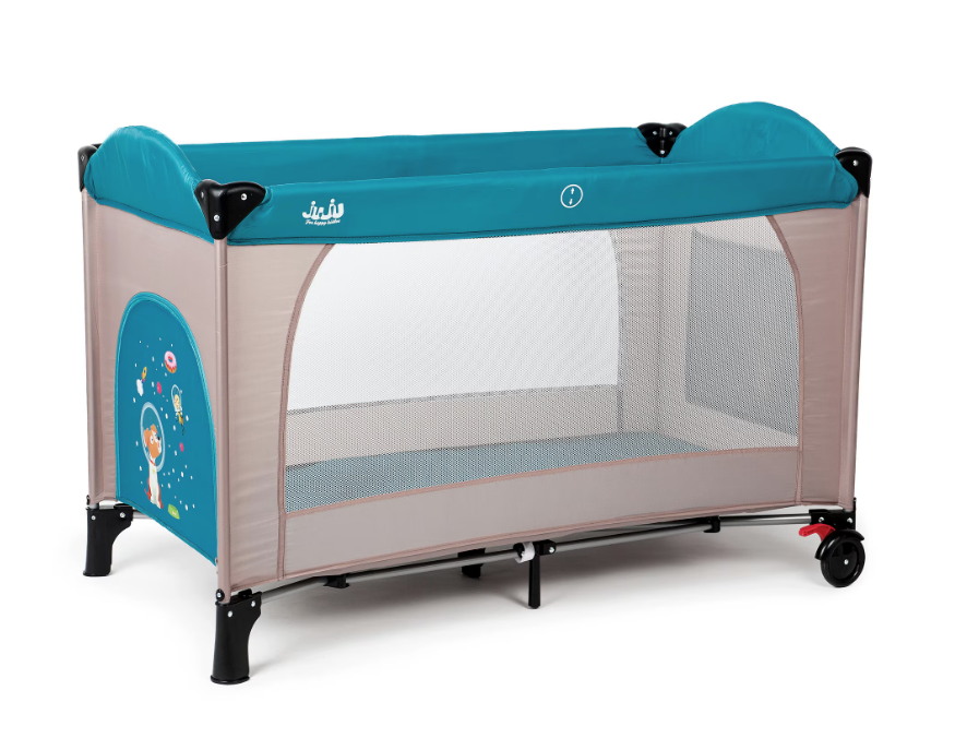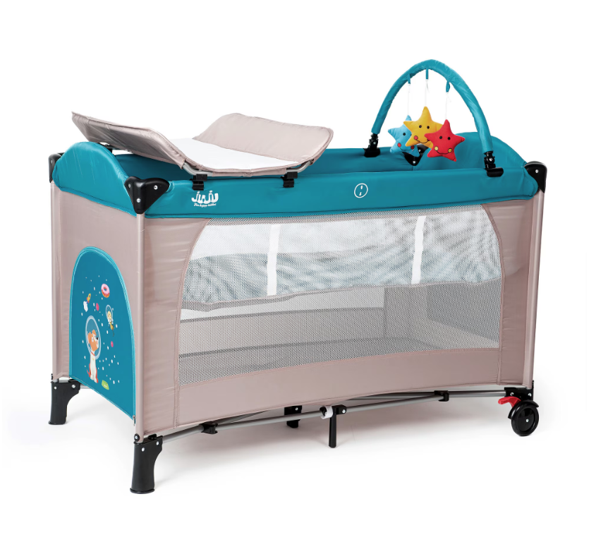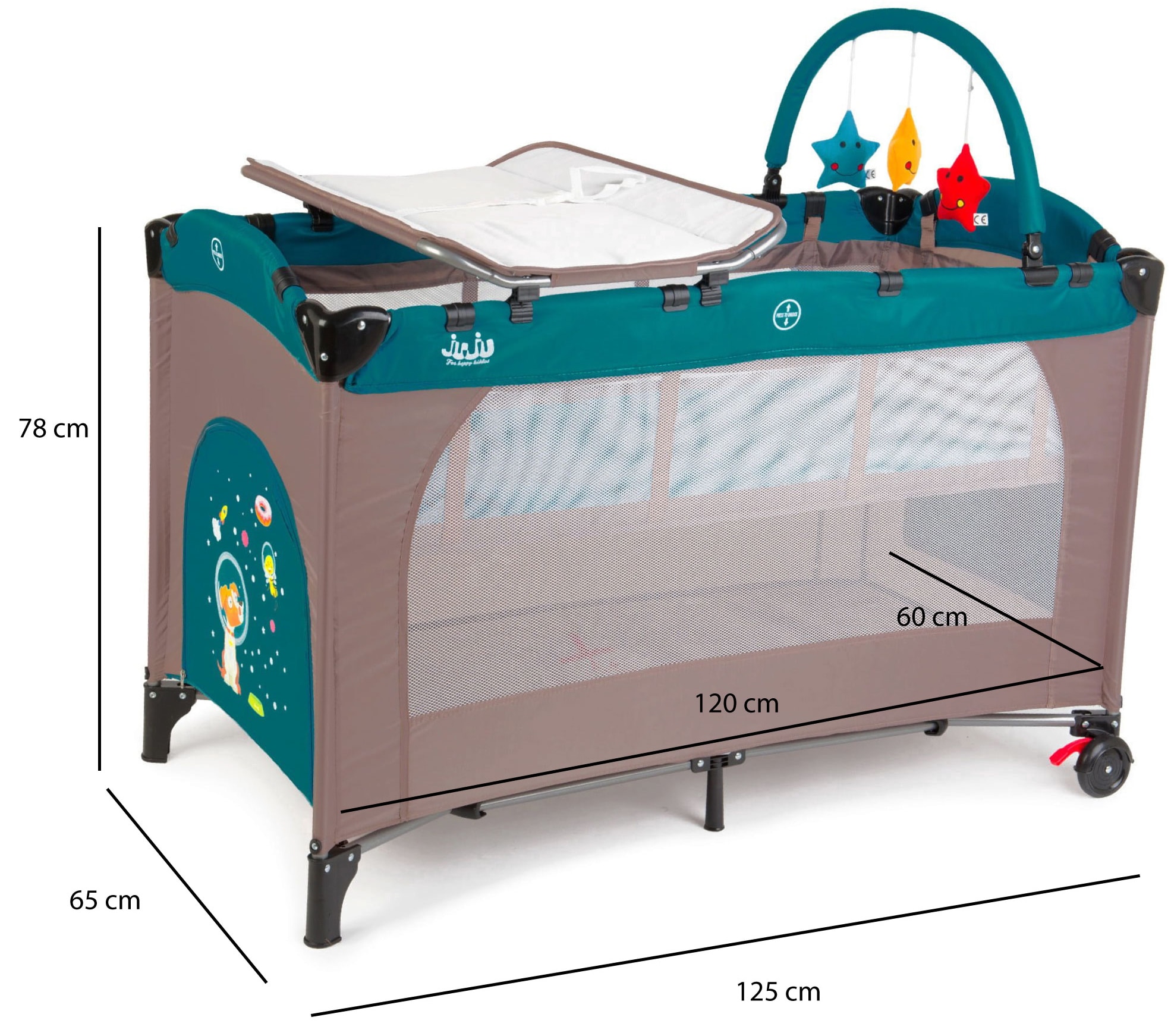 Patut pliant voiaj pentru bebelusi si copii Sleepy Baby, 2 nivele, portabil, 125×65 cm, etaj intermediar nou-nascuti, bara cu jucarii, masa de infasat, salteluta, buzunar lateral, geanta transport, Space Doggy, Bej/Turcoaz