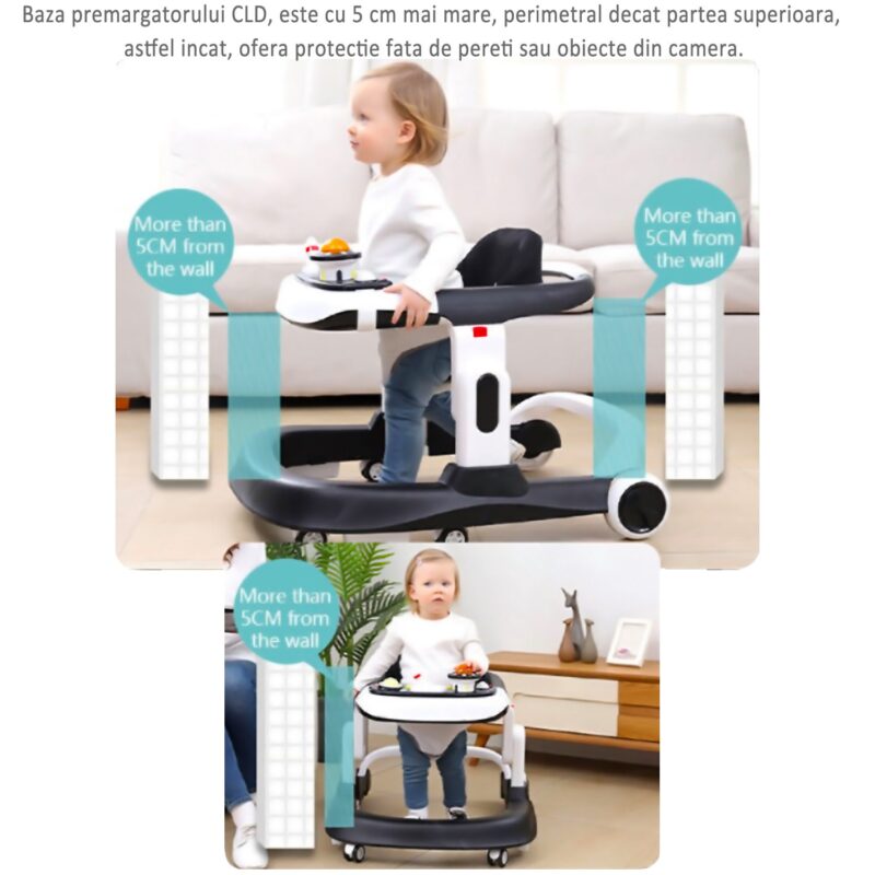 CADRU BAZEI MAI MARE decat PANOUL SUPERIOR – pentru ca cei mici, nu au simtul conservarii dezvoltat si nu stiu sa se fereasca de obstacole, pentru prevenirea accidentelor neplacute, am conceput baza Premergatorului mai mare cu 5cm pe fiecare latura, decat cadrul de sus, astfel ca ofera extra protectie impotriva obiectelor din camera sau a peretilor, atunci cand copilul se deplaseaza prin camera.