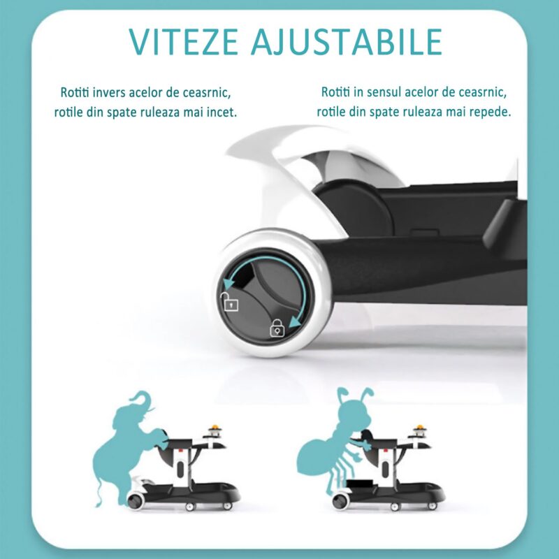 2 VITEZE de RULARE : In functie de modul in care doriti sa folositi Premergatorul, rotile din spate au optiunea de ajustare a vitezei de rulare, rotind clemele de pe lateralul rotilor, spre stanga – Viteza mai mica sau spre drepata – viteza mai mare.