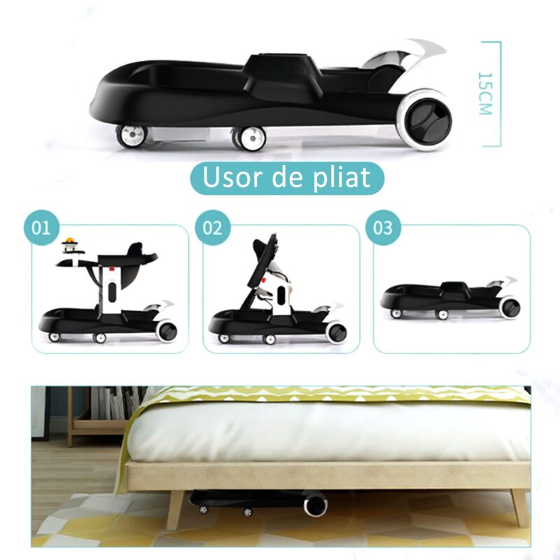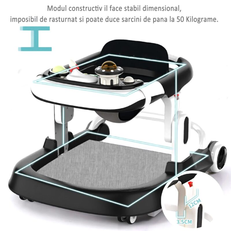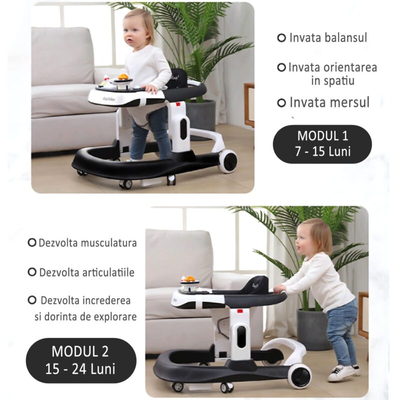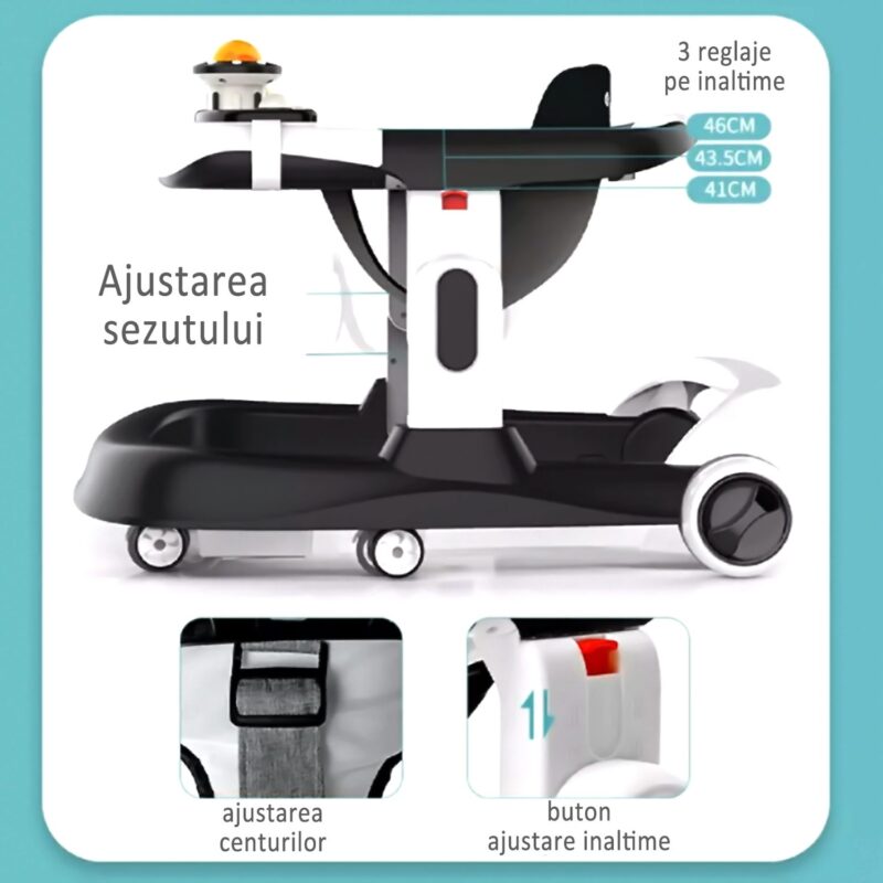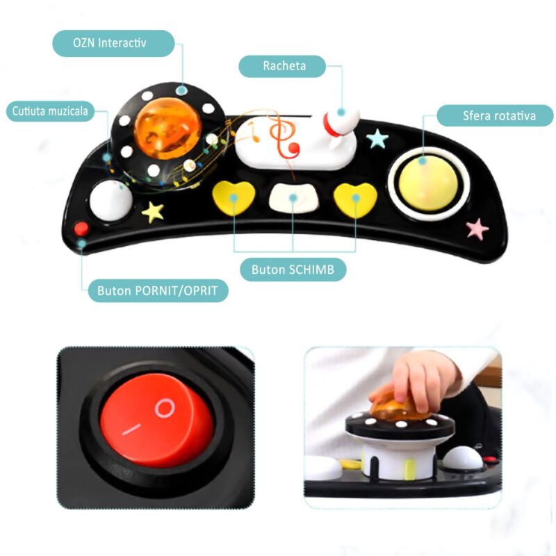 PANOU CU JUCARII INTERACTIVE – DETASABIL : panoul frontal contine mai multe jucarii interactive si acustice, menite sa tina copilul implicat, sa il ajute la dezvoltarea simtului tactil acustic, vizual si dezvolta creativitatea. In plus, acest panou este detasabil si tavita ramasa, poate fi folosita pentru o gustare intermediara, pentru desenat sau alte activitati creative.