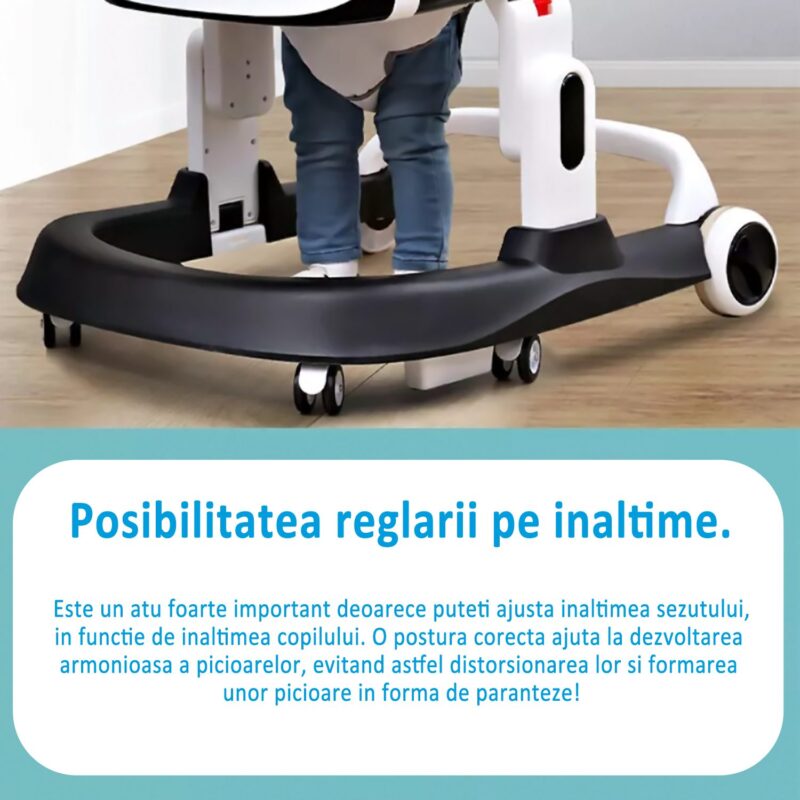 INALTIME AJUSATBILA : Copilul creste si se dezvolta zilnic, iar acest lucru impune adaptarea la noi inaltimi si posturi, astfel ca Premergatorul are 3 trepte de ajustare a inaltimii astfel incat, comparativ cu premergatoarele obisnuite care pot fi incomode, aveti posibilitatea sa ajustati inaltimea in functie de inaltimea copilului, un lucru extrem de importanta in dezvoltarea armonioasa si corecta, evitand astfel deformarile picioarelor si nedezvoltarea corecta a musculaturii, oaselor si tendoanelor. Este potrivit pentru copii cu inaltimile cuprinse intre 60 si 80 de cm sau varste cuprinse intre 7 si 24 de luni.