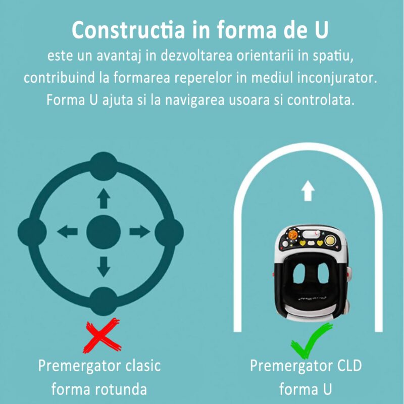 FORMA U : constructia premergatorului in forma de U , este extrem de importantanta pentru dezvoltarea orientarii in spatiu, comparativ cu premergatoarele rotunde care dezorienteaza si nu ofera puncte de reper precise, Premergatorul CLD il ajuta pe cel mic sa se orienteze precis in mediul inconjurator si sa navigheze cu usurinta si controlat.