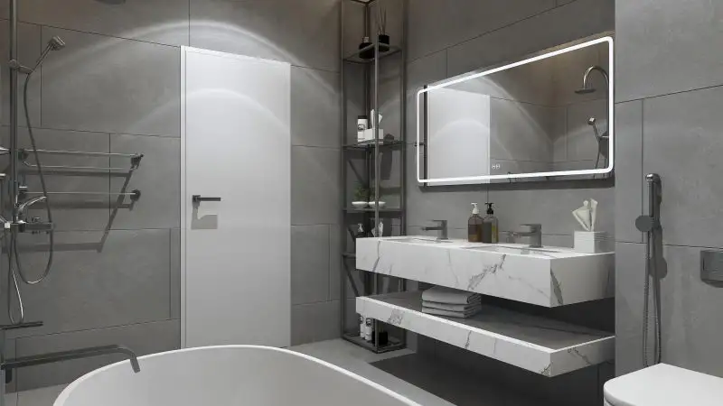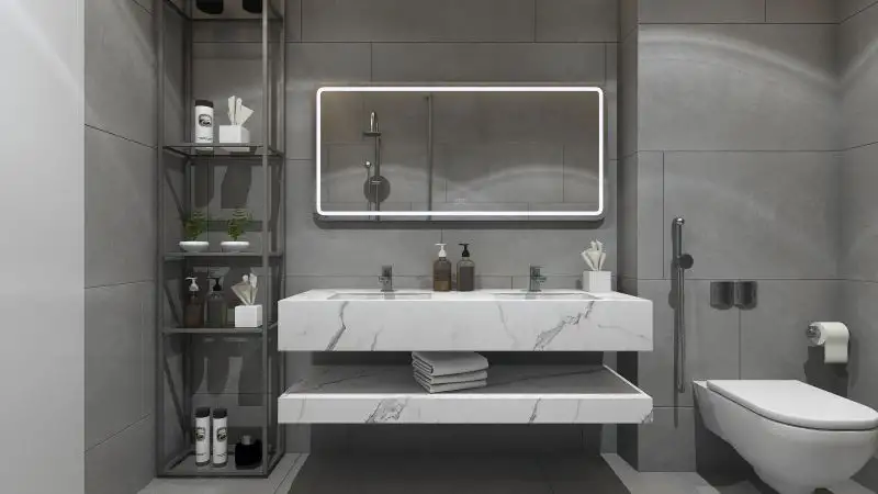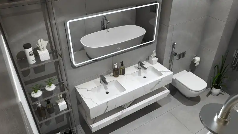 Fiecare set mobilier de baie modern este format din patru piese esentiale. Cele doua blaturi din compozit ceramic au o nuanta distinctiva de alb marmorat, aducand o nota de eleganta in baia ta.