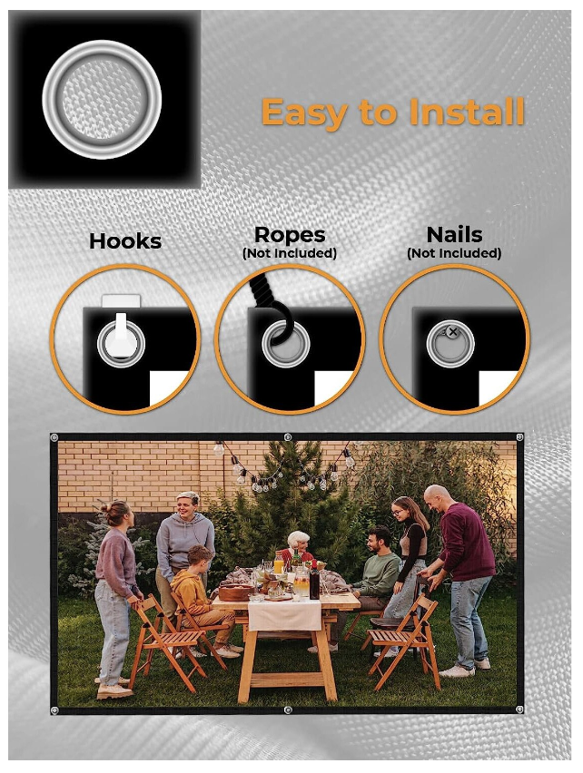 Portabil si usor de instalat: Ecranul de proiectie WEWATCH poate fi pliat la o dimensiune mica si poate fi plasat intr-un rucsac sau valiza, astfel incat sa poata fi luat cu usurinta cu tine. Cel mai important lucru este ca acest ecran de cinema in aer liber este echipat cu carlige si autocolante, asa ca dureaza doar 5 minute pentru a fi instalat. Nu este potrivit doar pentru utilizare in interior, ci si pentru utilizare in exterior. Este cel mai bun partener pentru proiector.